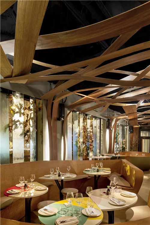在花道餐廳里,以少量但多彩的元素組成的軟裝配飾圖案裝點(diǎn)餐桌。設(shè)計(jì)大量使用了鮮艷的熱帶色彩:檸檬黃,清檬綠,熱情紅。它的有機(jī)形狀使人想起花瓣,這種設(shè)計(jì)泛用性很強(qiáng),在每張新桌子上都可以產(chǎn)生新的色彩組合。