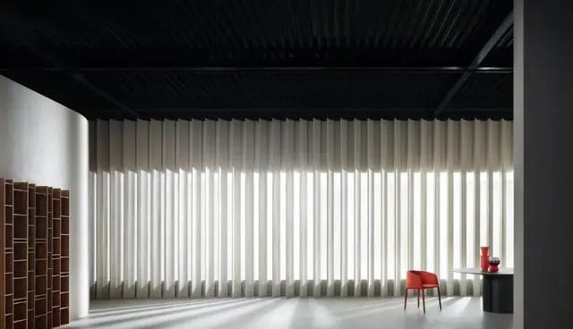緊挨著空間隔墻的黑色軟隔斷給清水混凝土增添了趣味,極具高級感又不失活力。