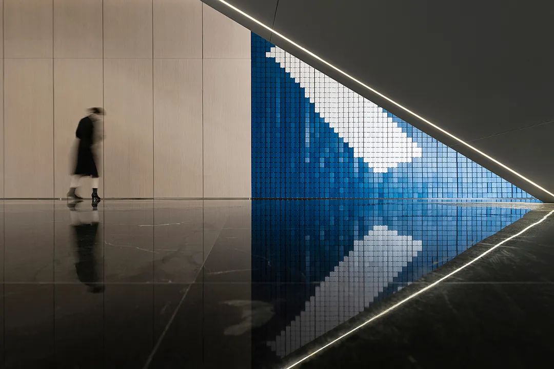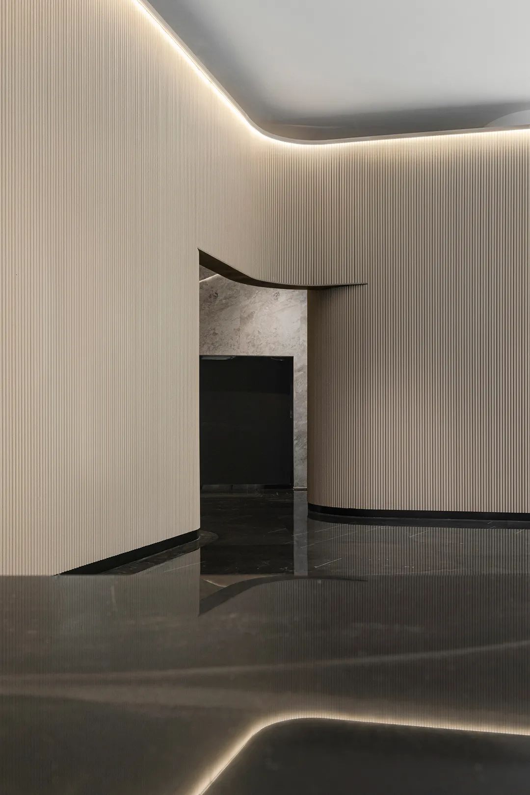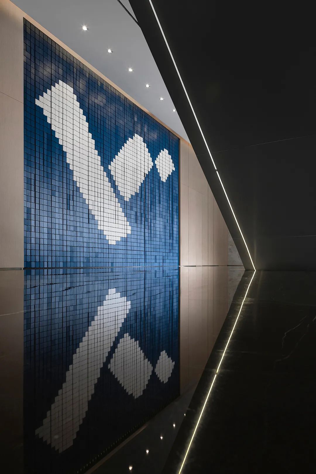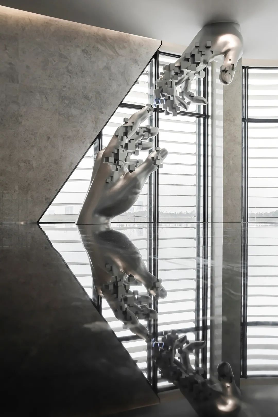 空間亮點在于,通過新媒體、交互藝術(shù)裝置、科技藝術(shù)裝置三大渠道,借由技術(shù)、工藝與美學(xué)的交織,讓人享受當(dāng)下,感知未來,從而探索未來。在這一宏大的設(shè)計構(gòu)想下,空間是對信息化時代的隱喻,“人們進(jìn)入的銷售中心,我們將其擬作信息中心,設(shè)想來訪者是其中的信息源,以數(shù)字化狀態(tài)對信息中心進(jìn)行探索,實現(xiàn)人與空間的新型交互。”