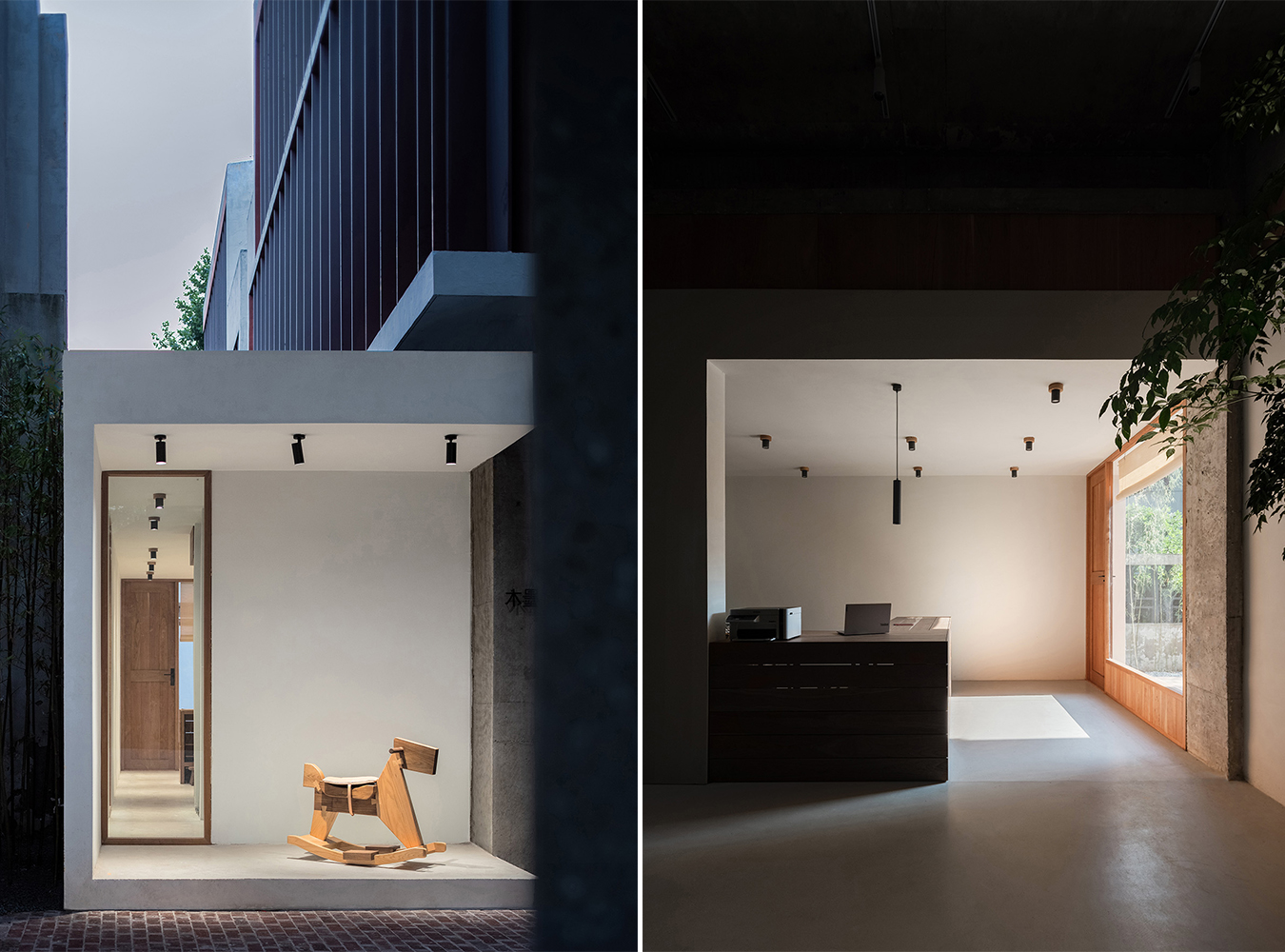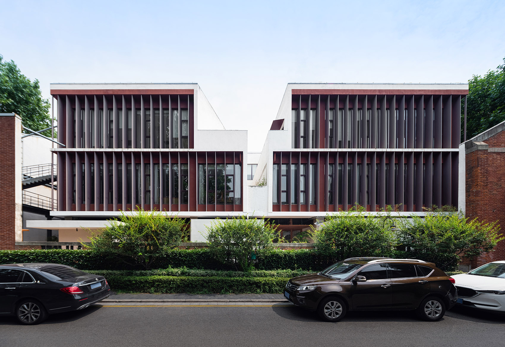 項目的位置正是這棟老樓首層的一側(cè)沿街空間。嚴(yán)格來說,這不是一棟完整的老樓,早期是民國時期江南造幣廠的車間,園區(qū)改造時,新建一棟辦公樓在其內(nèi)部,只剩下幾片高聳的紅色磚墻,延續(xù)著它的前世今生。紅色磚墻上的窗洞著聯(lián)系內(nèi)外兩側(cè)的風(fēng)景,外側(cè)是城市,內(nèi)側(cè)的當(dāng)代建筑脫開磚墻而立,其間的空隙自然形成過渡空間。
