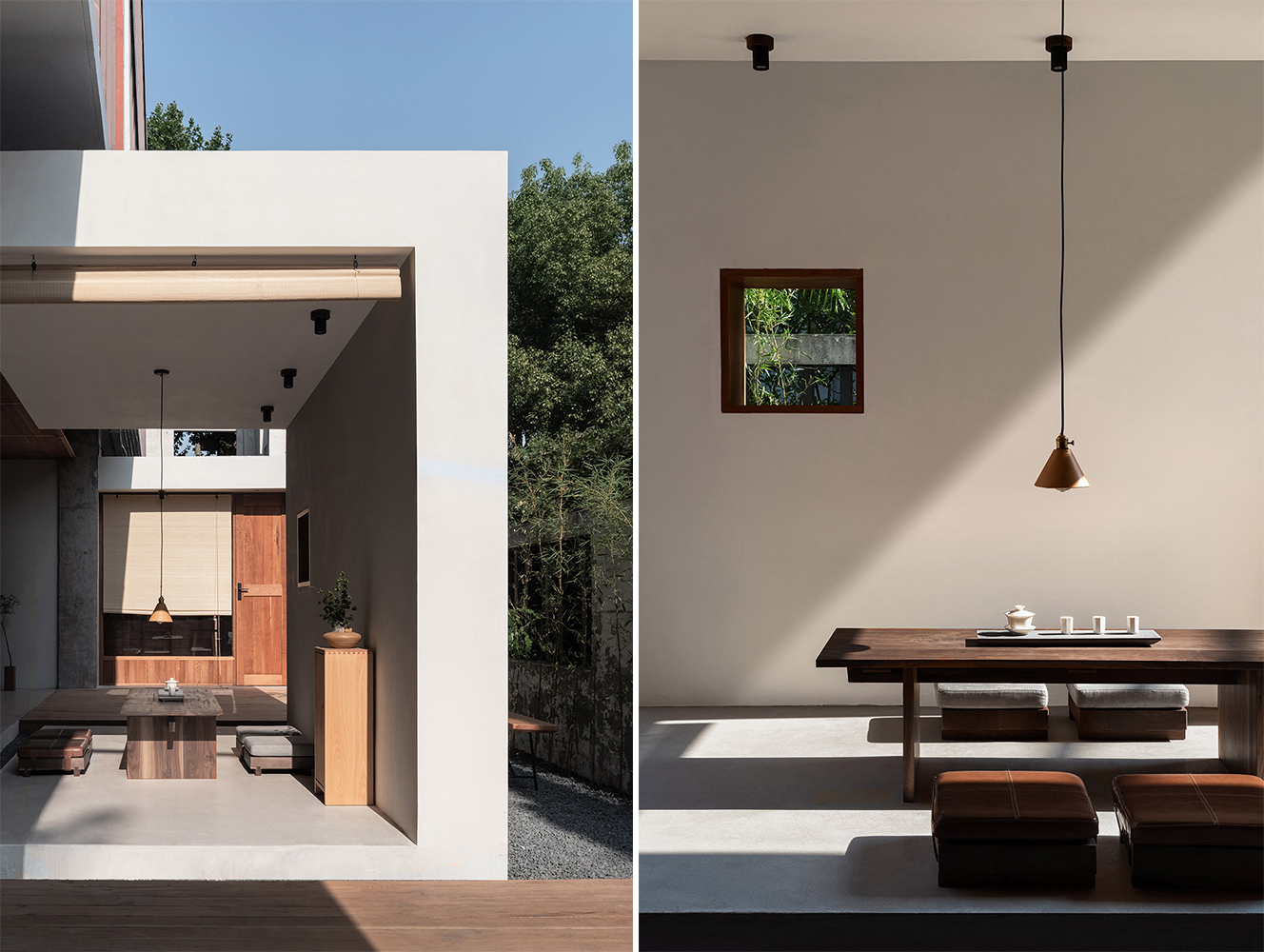 在內(nèi)部庭院,室內(nèi)的原木吊頂向庭院延伸,新的立面退后消隱,室內(nèi)外空間融為一體。C字形茶座坐落于院中,對外部的城市環(huán)境進(jìn)行局部的限定,通透的空間因此多了一分內(nèi)向。