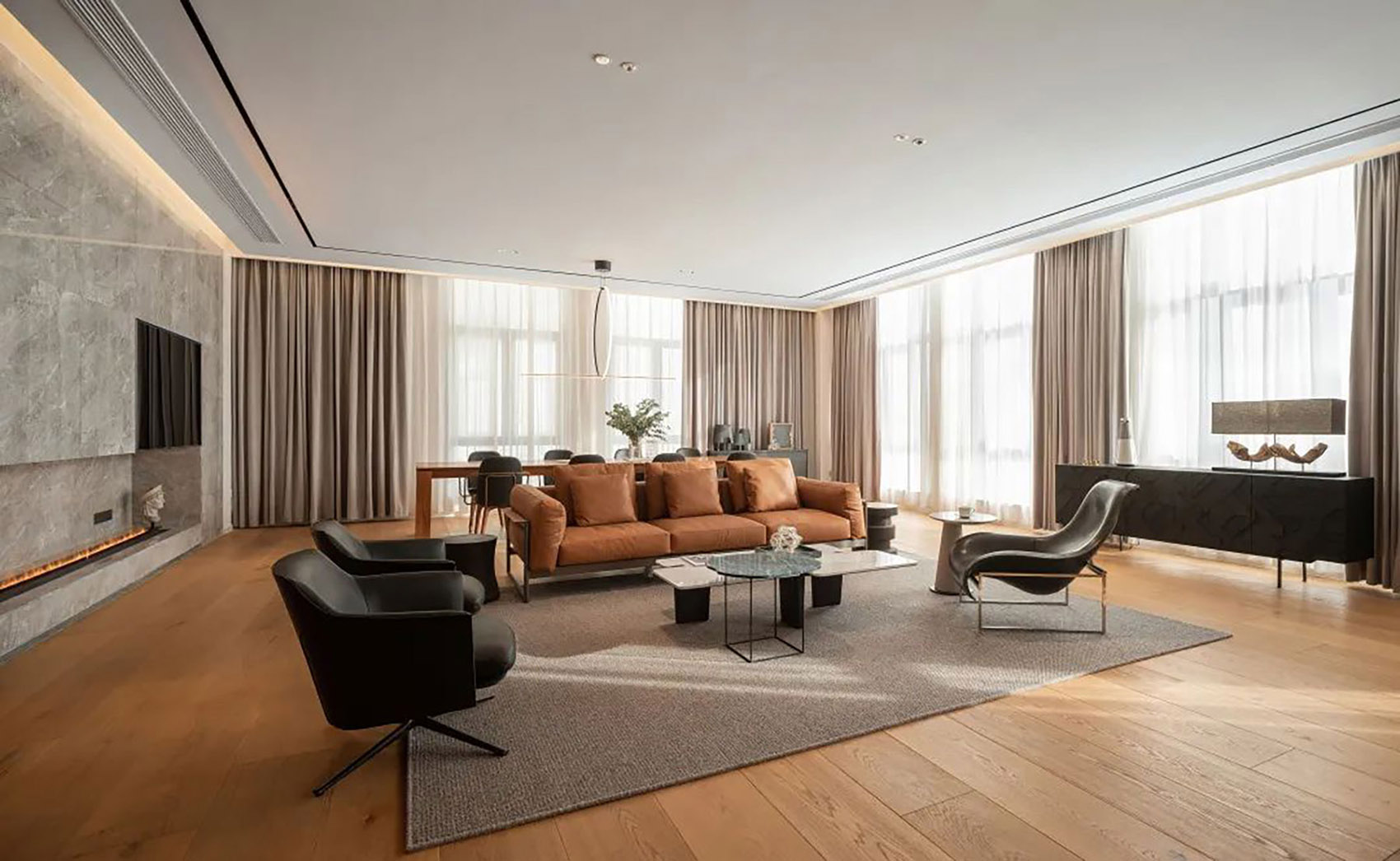 總經(jīng)理辦公室,以黑色和橘棕色的家具為主,灰色大理石墻面精致而冷峻,LED仿真壁爐增添了幾分溫暖和閑適,通過材質(zhì)的運(yùn)用和軟裝搭配讓空間兼具時尚與質(zhì)感。不管繁雜的工作如何變化,都能讓公司有機(jī)地不斷向上成長。