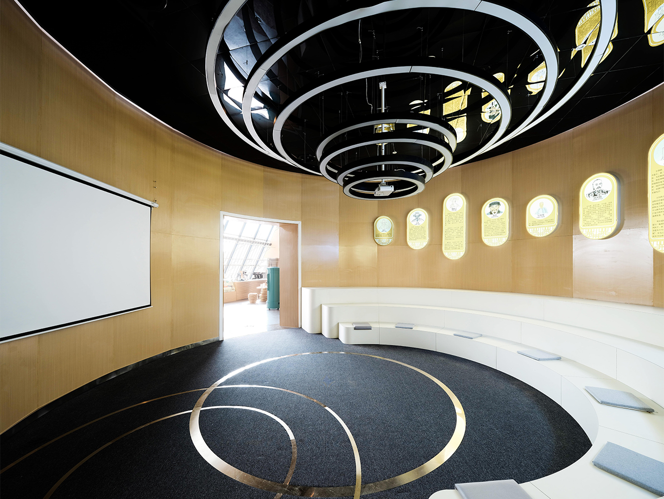 東太湖慧客廳整體風格以原木色為主,聲音流淌在木質(zhì)紋路中,給人以溫暖、舒適的感覺?;劭蛷d的設計靈感則來源于太湖景區(qū)的代表元素:太湖水面泛起的漣漪與聲波十分相似,我們從中提取了圓形元素;而湖灣的整體外形又與水流的形態(tài)十分相似,我們從中提取了流動的概念,層層圓形與流動的線條相結合生成了整個展廳的空間。