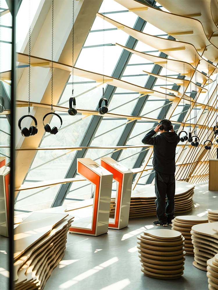 水流的元素貫穿了主廳的整體設計。設計師采用水流的形態(tài)將整個空間包覆,所有墻體都由漣漪型的格柵構成,在視覺方面讓游客們感受到回蕩在整個空間內(nèi)的聲音。除此之外,富有流動感的墻面容納了“聲音明信片”、“聲音檔案館”、“聲音工作坊”等功能,靠窗一側的“耳機森林”、“文創(chuàng)展示”及“休閑座椅”等空間也是依據(jù)相同的理念設計而成。展廳內(nèi)的座椅與展臺也都依托水流形態(tài)延伸而成,與墻面風格統(tǒng)一。