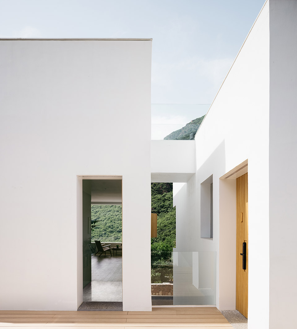 為了處理這兩者之間的關(guān)系,我們結(jié)合功能與場地將建筑主體分為三個白色極簡的體塊,構(gòu)成相對獨立的生活單元,同時為了增加體塊間的趣味性,與場地設(shè)置了三種不同的關(guān)系——嵌入、漂浮與相接。反映到室內(nèi)空間則是地下室、懸挑樓板、下沉休閑區(qū)。建筑體塊之間的甬道,不僅形成可供穿梭的交通空間,使每個房間都可直接抵達室外,同時體塊與場地的高差關(guān)系,甬道像“橋”一樣把使用者從場地外引入建筑內(nèi)部,縱橫交錯的走廊使身處其中的人迷失在不同的水平與空間。甬道兩側(cè)的墻體框住遠處的山景以及頭頂?shù)奶炜?,給人一種置身峽谷之間的錯覺。