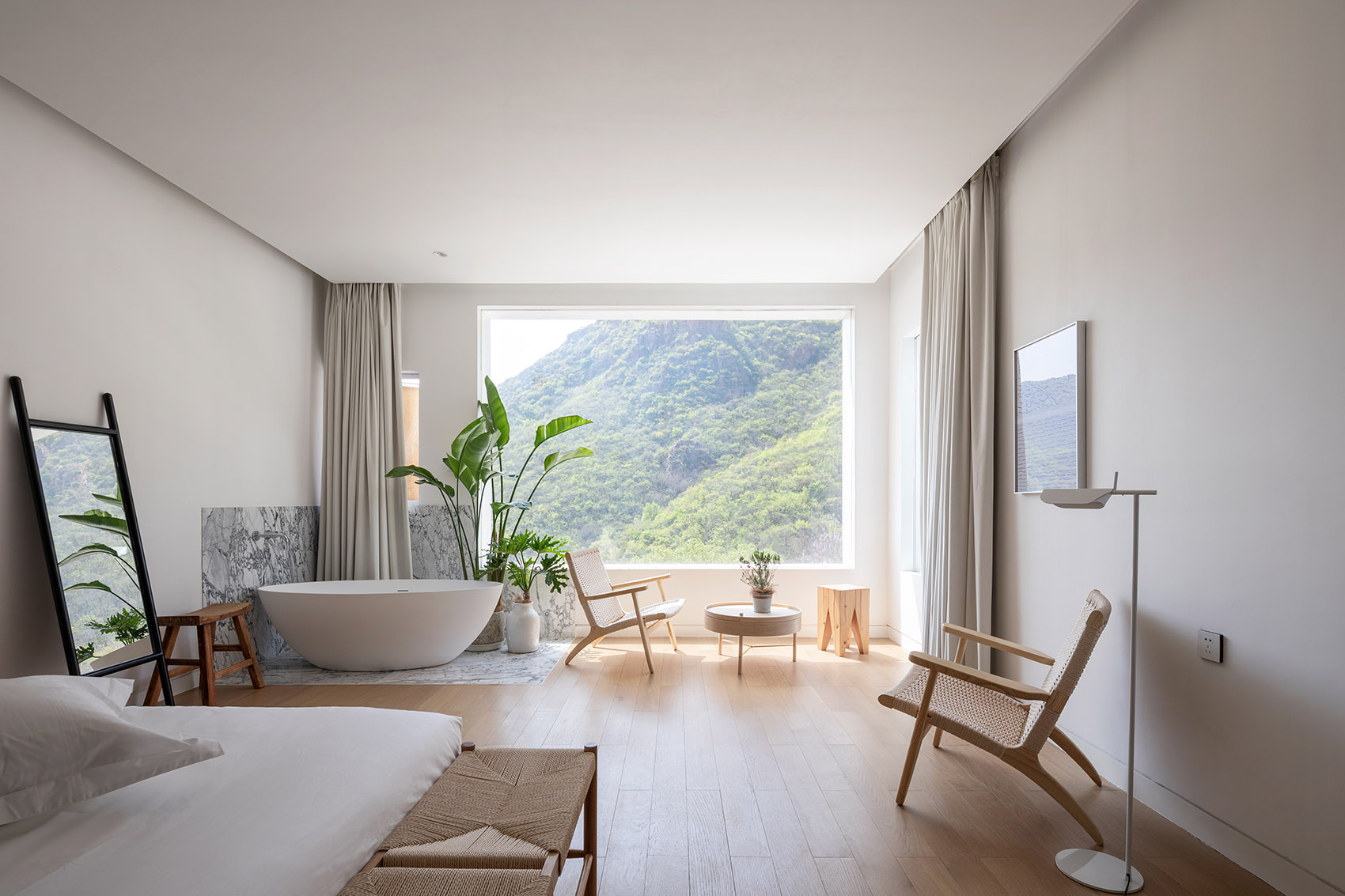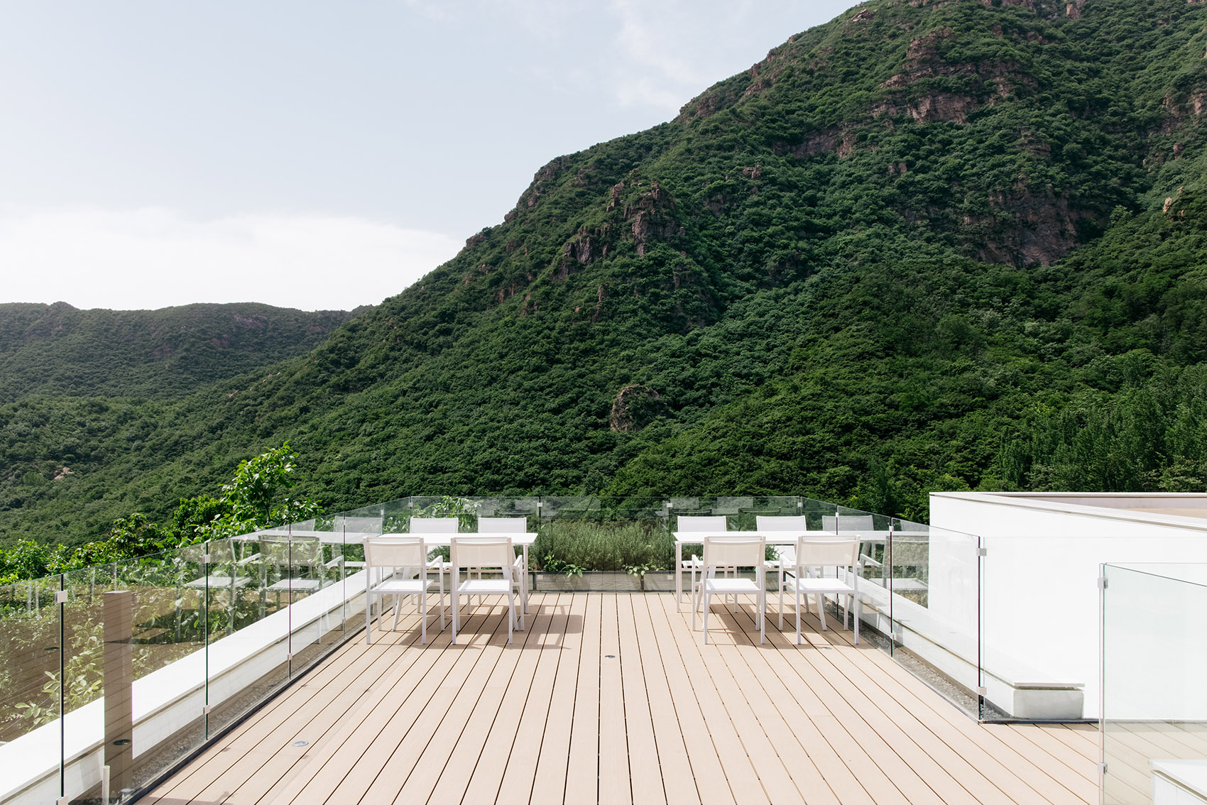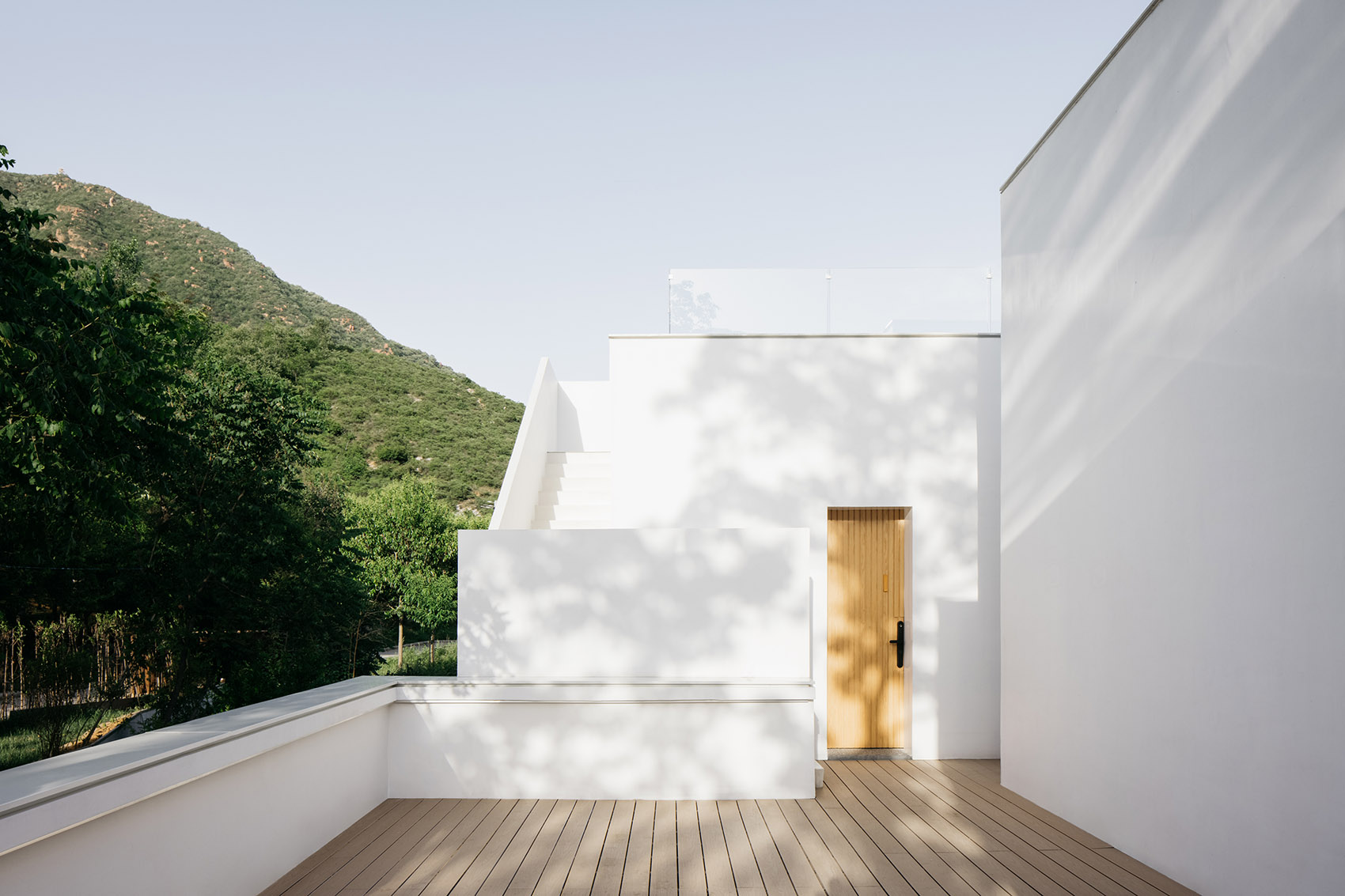 體塊之間的進退變化,使室內(nèi)看到不同方向的山景。登上屋頂平臺,不遠的群山亦像在俯身對望,建筑與自然的對話在山谷間娓娓道來,“我見青山多嫵媚,料青山見我亦如是”。