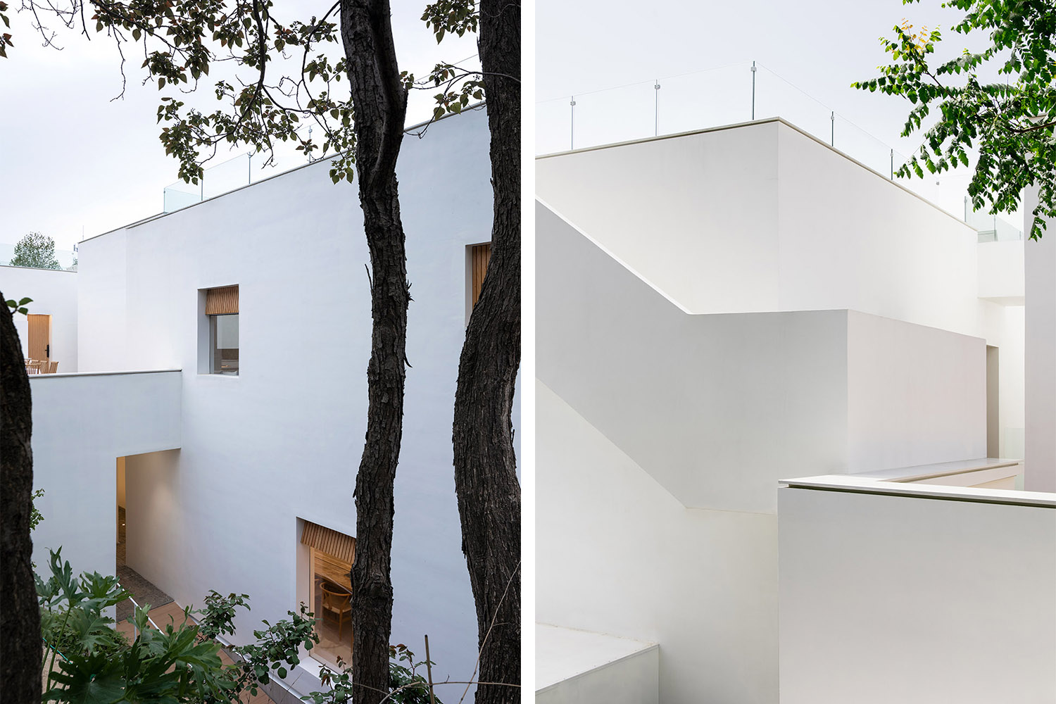 這些“橋”結(jié)合室外樓梯和功能用房的屋頂平臺既使每個體塊相互獨立、過渡,又可聯(lián)系相聚。“分與合”的生活狀態(tài),通過建筑體塊分隔后的距離感與服務(wù)空間的整合得到回應(yīng)。