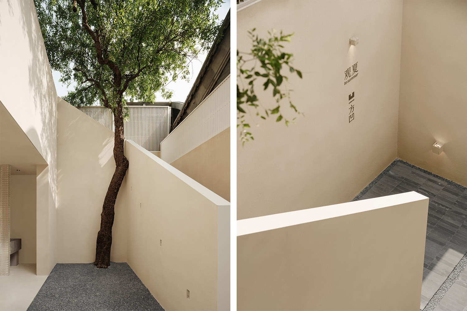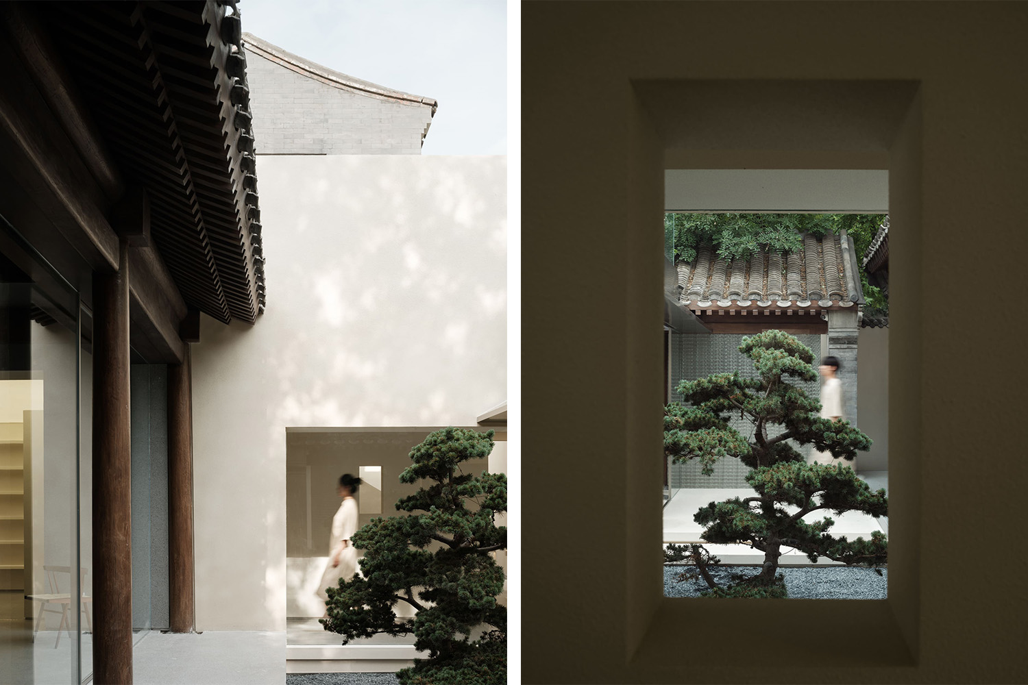 經(jīng)過篩選的建筑構(gòu)件和空間場景經(jīng)過“二次曝光”呈現(xiàn)為一系列松散的平行結(jié)構(gòu)。傳統(tǒng)四合院強(qiáng)調(diào)居住空間的私密性和院落之間的遞進(jìn)關(guān)系,從門屋、廳堂到私室、閨房,布局方正,主次分明。而由民居到公共商業(yè)空間的改造勢必需要新的設(shè)計(jì)思維——用“反四合院”的方式,弱化了場地整體的封閉性以及院落之間的阻隔,圍合房屋的墻體多數(shù)被玻璃取代,充當(dāng)物理阻隔的同時(shí)讓視線變得通透開敞,空間也擺脫了原本局促的尺度和動(dòng)線。