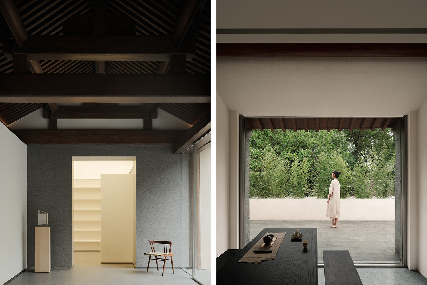 以同一思路處理房屋的梁柱結(jié)構(gòu),讓院子“清瘦”下來,讓建筑的“骨骼”顯露出來,以“柱陣”的形貌成為整個(gè)空間的視覺重心和界定其輪廓的重要結(jié)構(gòu)系統(tǒng)。當(dāng)自然光經(jīng)過柱陣投射在地面和墻壁之上,柱子的等距排列標(biāo)記出明暗規(guī)律,光影取代高墻,給予空間縱深感。