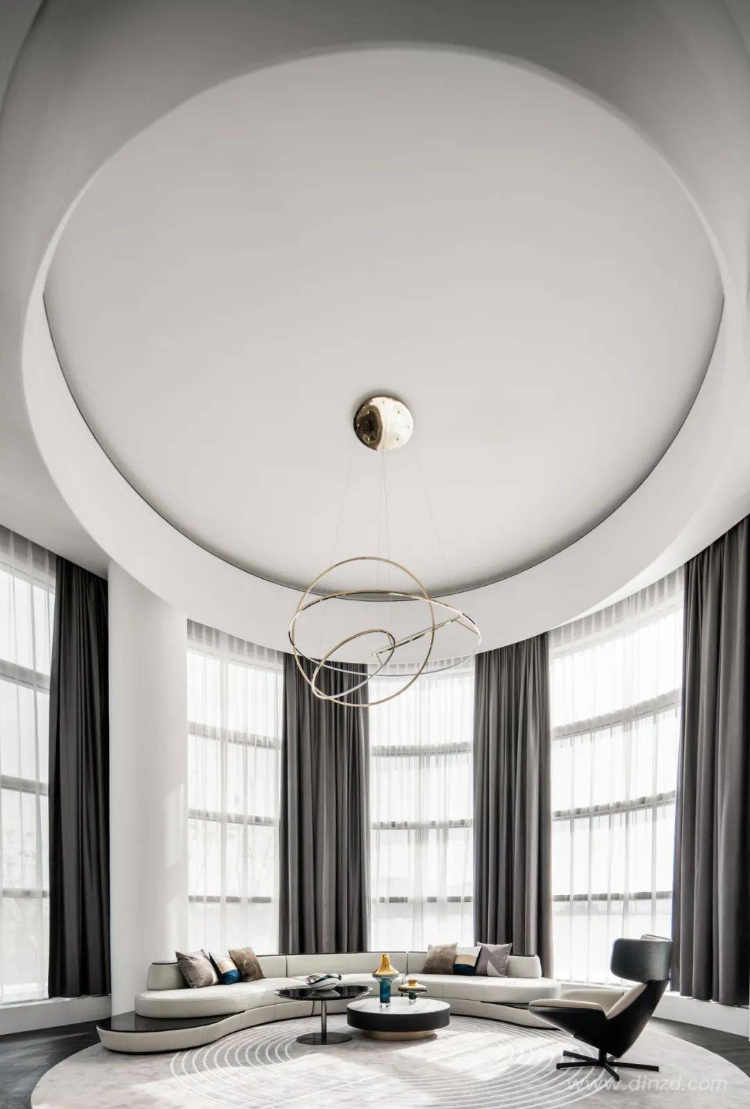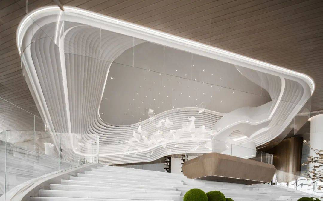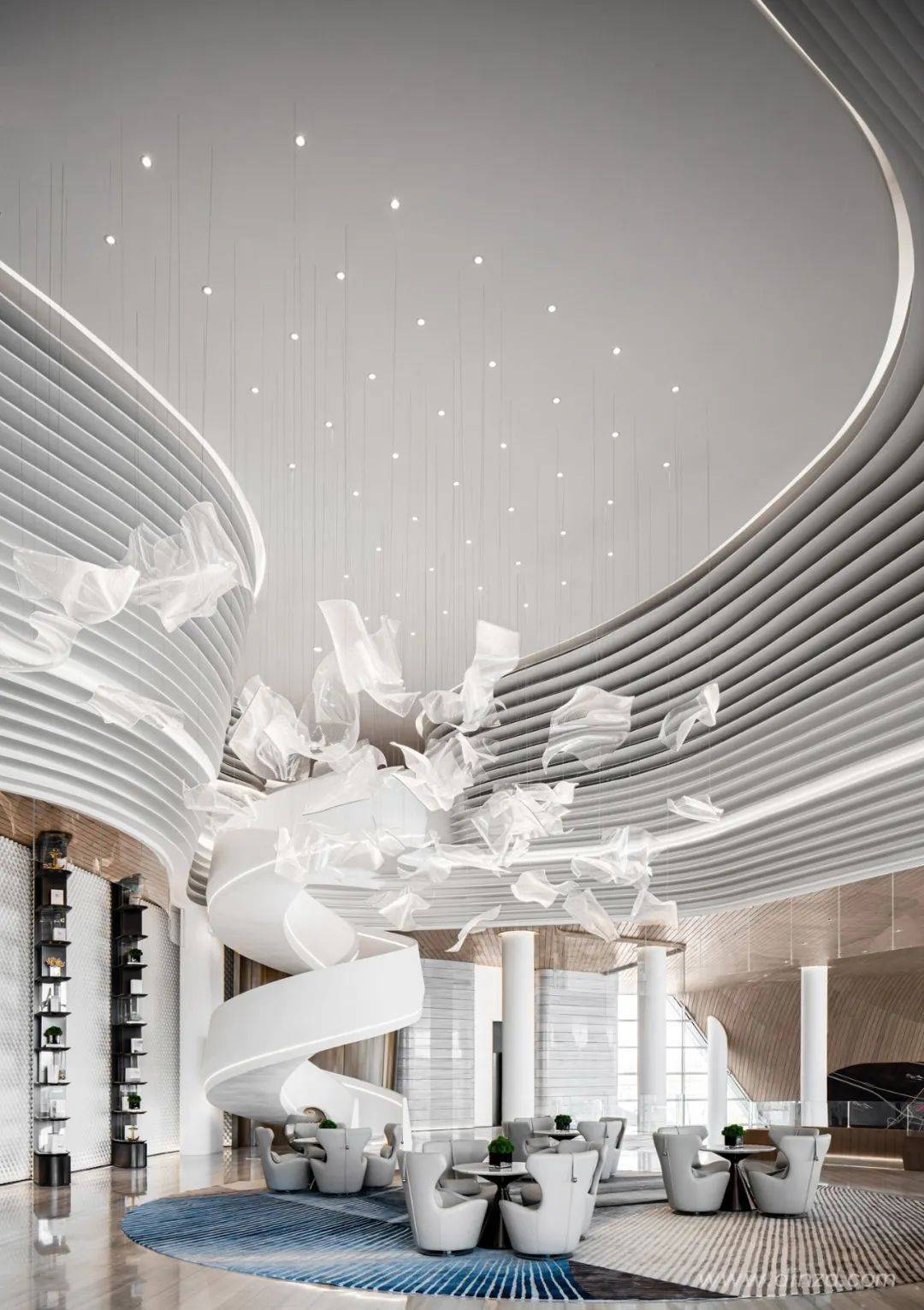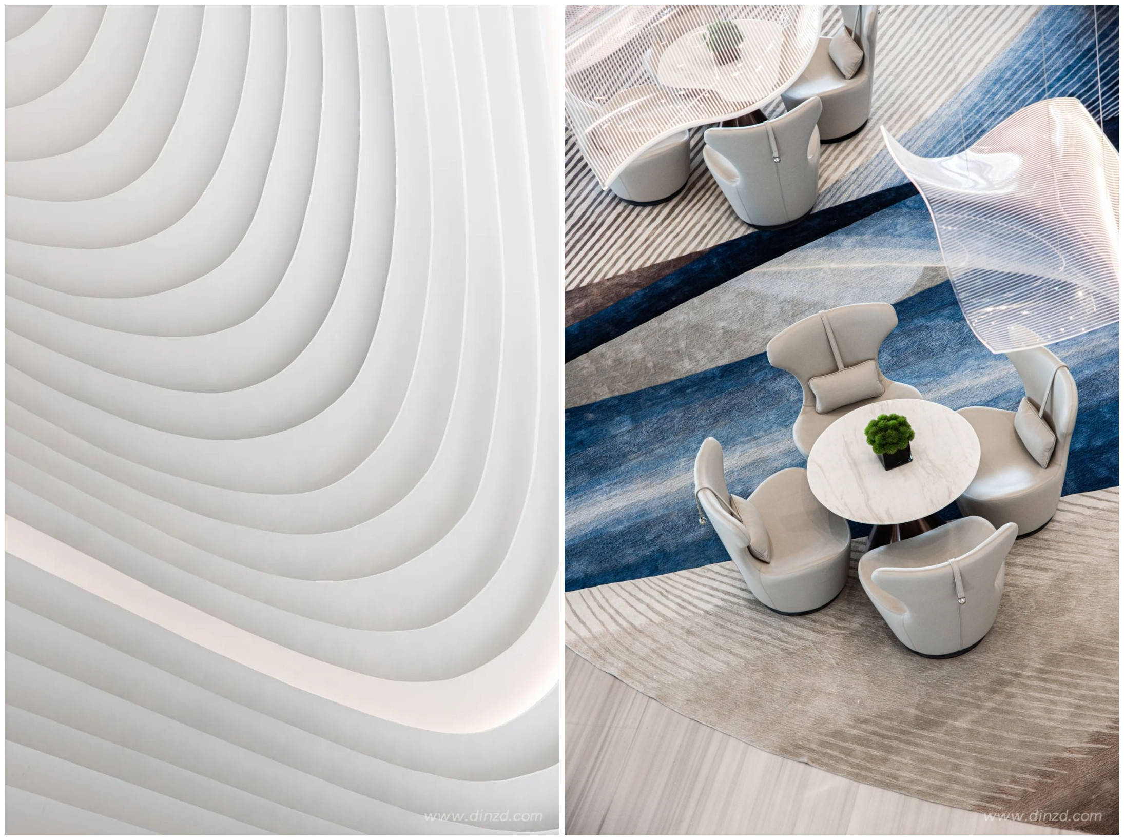 設(shè)計(jì)師對(duì)變化無窮的自然現(xiàn)象的癡迷轉(zhuǎn)譯成了設(shè)計(jì)的一部分,海水跟隨潮汐的起落呈現(xiàn)出不同的形態(tài),空間亦是如此。點(diǎn)點(diǎn)星光投射在形狀各異的天花裝置上,靈動(dòng)而富有生機(jī),層層曲線自由流淌在天花之上,與地面的那一抹藍(lán)呼應(yīng)。
