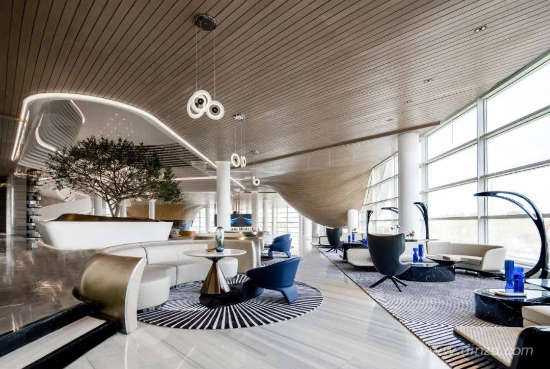 藍(lán)白交替的座椅強(qiáng)調(diào)了海浪的設(shè)計(jì)元素,原木天花與“精靈之樹”營(yíng)造原始的生機(jī),是人文生態(tài)的象形物,亦是大自然饋贈(zèng)的象征。VIP室利用弧形幕窗營(yíng)造私密的設(shè)計(jì)格調(diào),打造純粹干凈的私享空間。