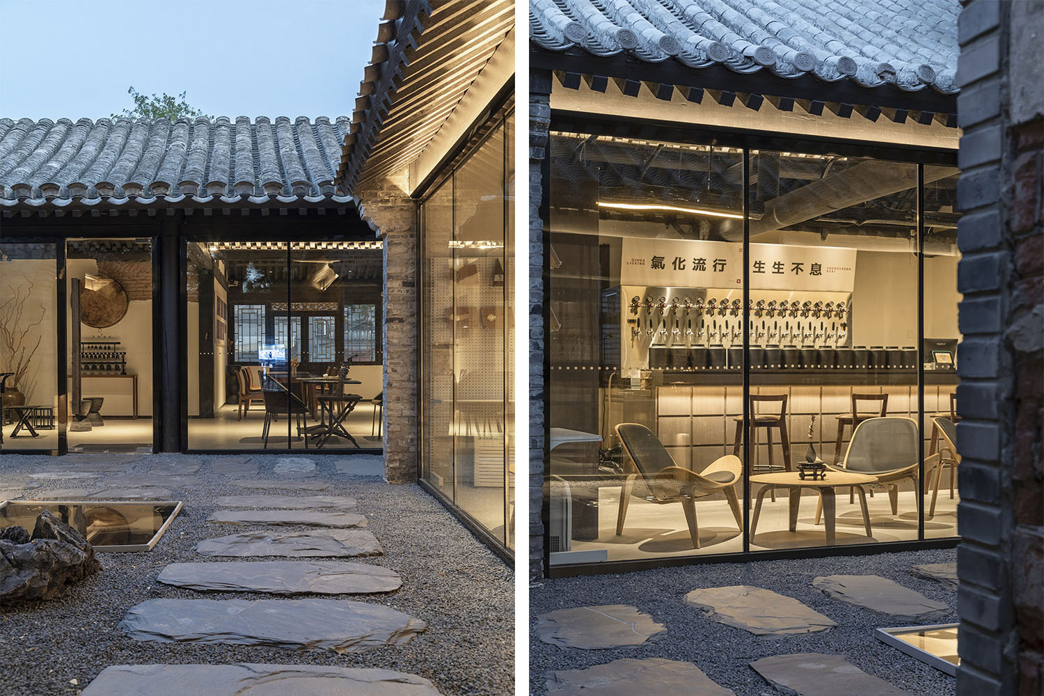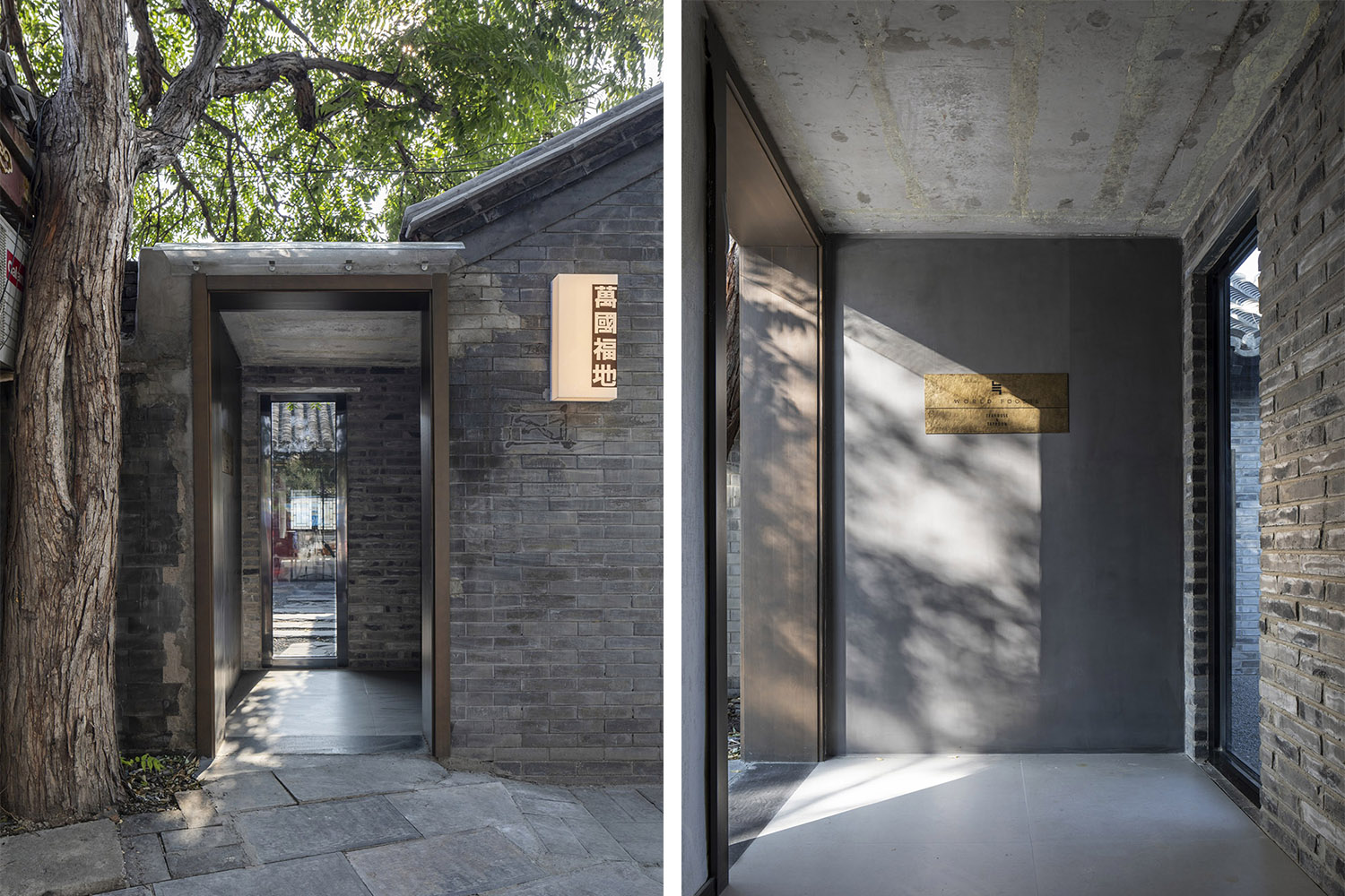 原生場地是一個面朝南新華街的合院。從狹窄的入口通行,空間關系是北京傳統(tǒng)四合院的簡化版,我們對院子做了重新解構——盡管原有的空間屬性是全封閉的,設計師希望仍然保持疏密有序的感覺,因此將封閉的院子做得盡量通透、明亮。我們注重進入內(nèi)庭院后的感受,來訪者所見皆是自己視野內(nèi)的建筑,這是貫穿在設計過程中的邏輯,既需要有一定的透氣感,也要保證私密性。