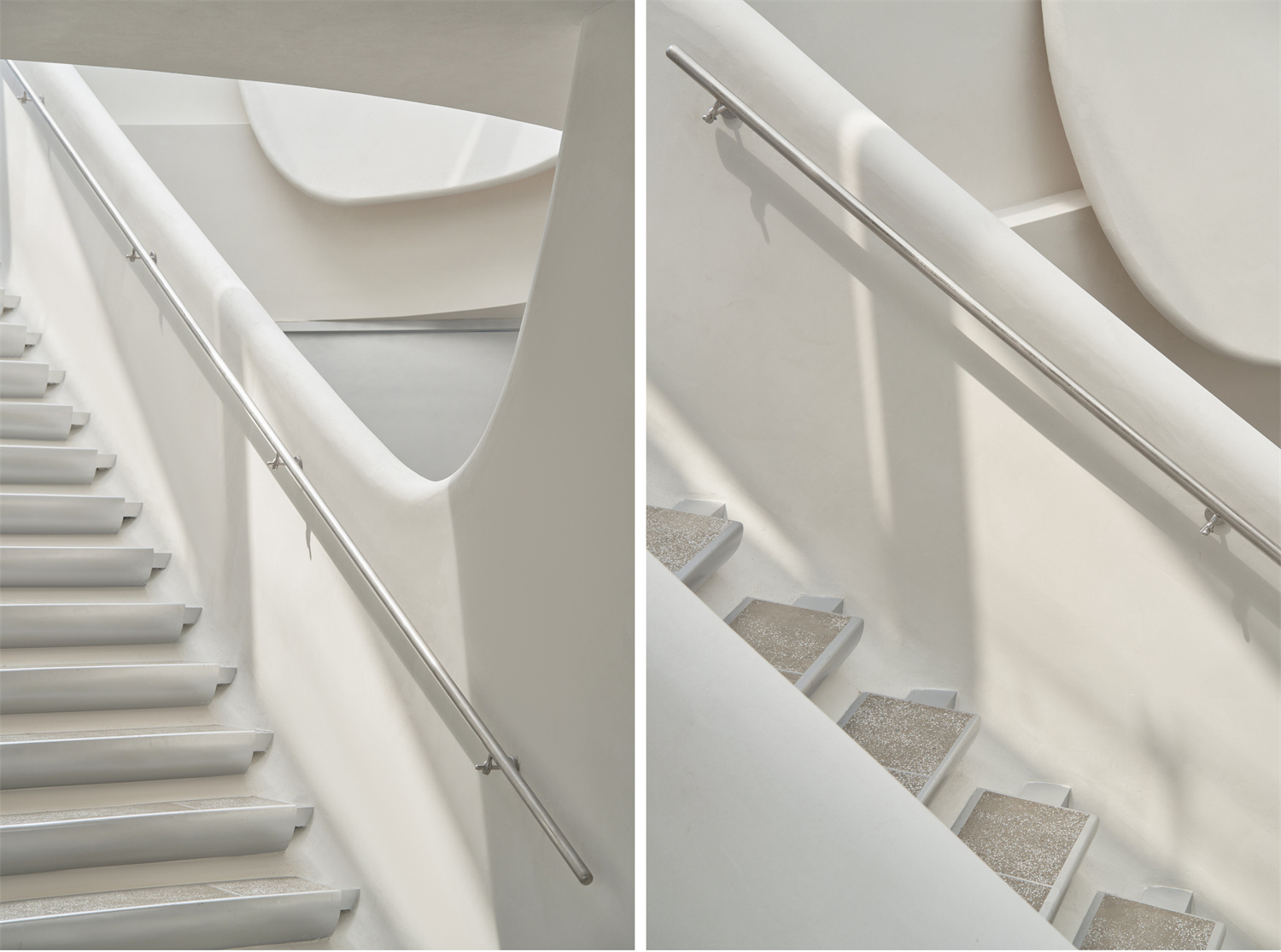 柔軟曲線的檐口大弧度,蔓延至行云流水般的樓梯造型,宛如貝殼,塑造親海洋生物屬性的未來(lái)藝術(shù)感,形成空間氣場(chǎng)的獨(dú)特性和差異性,契合拍攝服務(wù)與社媒傳播的瞬時(shí)場(chǎng)景記憶。