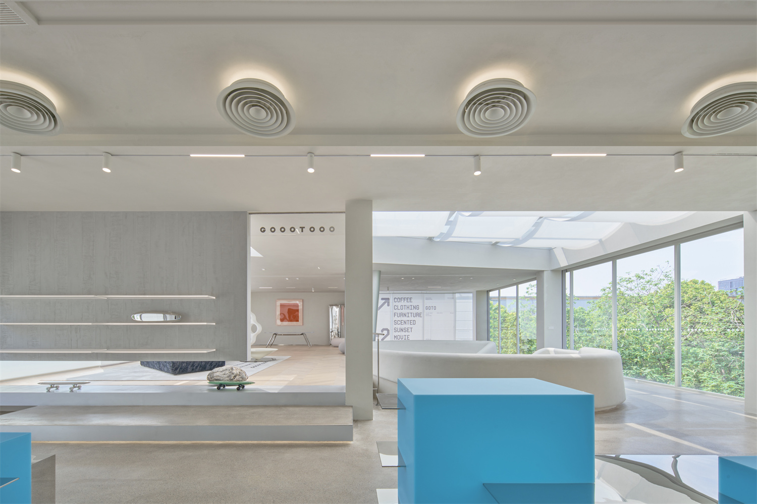 設(shè)計(jì)師將GOTO文化理解為一種“未被設(shè)定”的狀態(tài),懷揣朝著未知目的地出發(fā)的向往,回應(yīng)當(dāng)代年輕人自由隨性的生活方式。原建筑為機(jī)械金屬?gòu)S車間,設(shè)計(jì)師提煉GOTO的品牌調(diào)性融于設(shè)計(jì)語(yǔ)言,用包容而純粹的藝術(shù)柔韌度,延續(xù)場(chǎng)地的生命力,使原本荒廢落寞的建筑變得親和有趣。