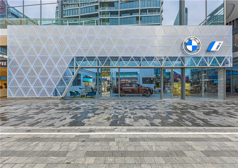 深圳歡樂港灣,是臨海的黃金商區(qū)。項目選址于此,希望其打造為一個有機的場所,賦能BMW i品牌,增益在地生活。因此,設計師要構(gòu)筑的不只是一個高品質(zhì)空間,更是以人為本的全方位優(yōu)質(zhì)交互體驗。進店之前,數(shù)字化體驗旅程就已開始。迎賓立面覆蓋“BMW i車型前進氣格柵的經(jīng)典菱型元素”為母題的半透明幕墻,以動態(tài)流轉(zhuǎn)的當代光電藝術(shù),與城市產(chǎn)生對話。