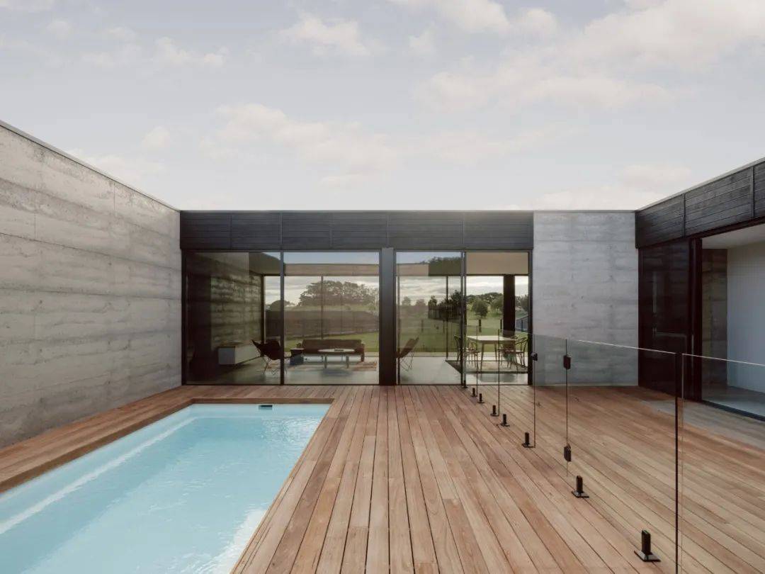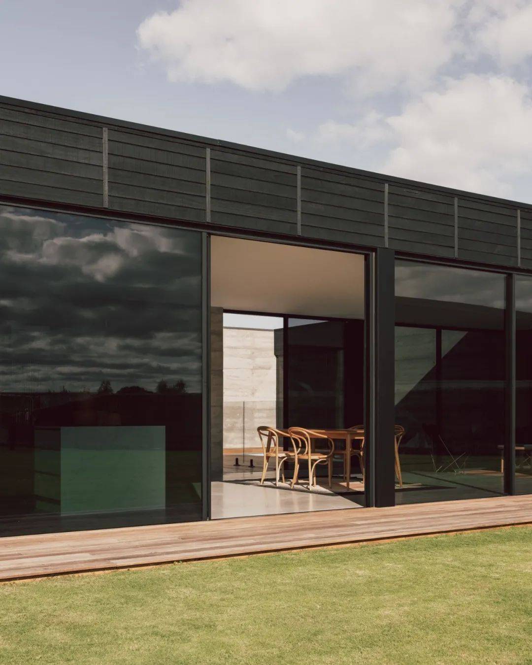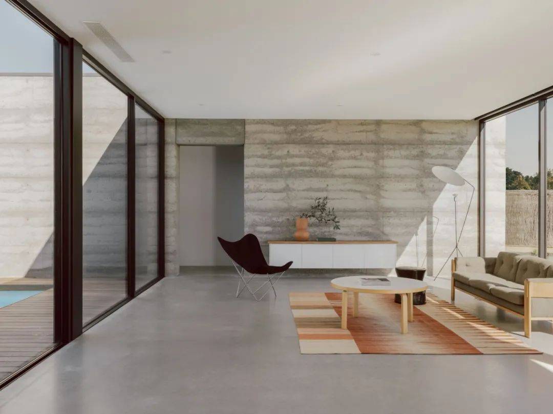 與深色、整體的外觀形成鮮明對比的是,內(nèi)部采用了600毫米厚的夯土墻和木材裝飾板,營造溫暖色調(diào)。中央庭院和游泳池遠(yuǎn)離自然環(huán)境,住宅的核心是鼓勵(lì)玩耍和娛樂。