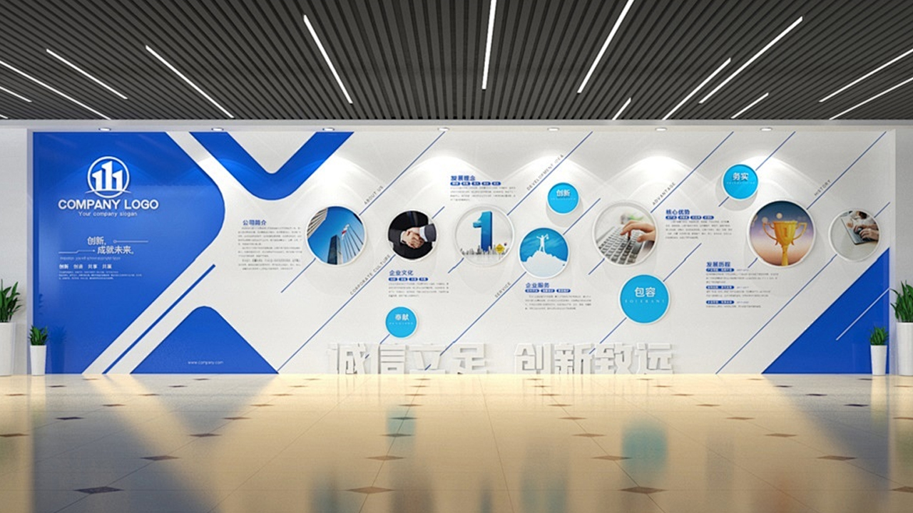 要做的文化墻顯大氣,整體版面盡量用亮膜PVC的材質(zhì)或者選用具有質(zhì)感的材質(zhì),造型簡(jiǎn)潔,復(fù)雜的造型短時(shí)間可以,長(zhǎng)時(shí)間就不太耐看。所以要采用簡(jiǎn)潔的造型,方形圓形、橢圓等來(lái)表現(xiàn)既簡(jiǎn)潔又大氣。在顏色運(yùn)用方面控制在三個(gè)顏色以內(nèi),國(guó)際的設(shè)計(jì)標(biāo)準(zhǔn)超過(guò)三種色人們?cè)趨⒂^的時(shí)候就會(huì)感到視覺疲勞。我們的文化墻使用來(lái)閱讀的,一定不能讓人感覺到疲倦。